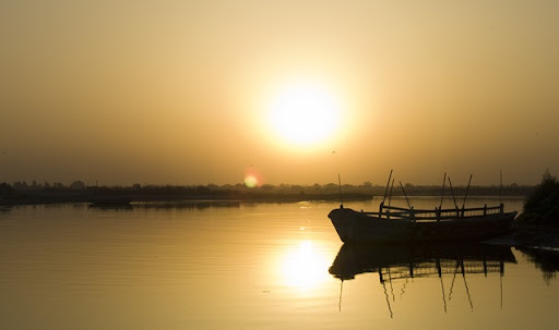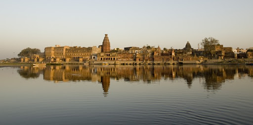 Temple along the Yamunua and the Yamuna at sunset.